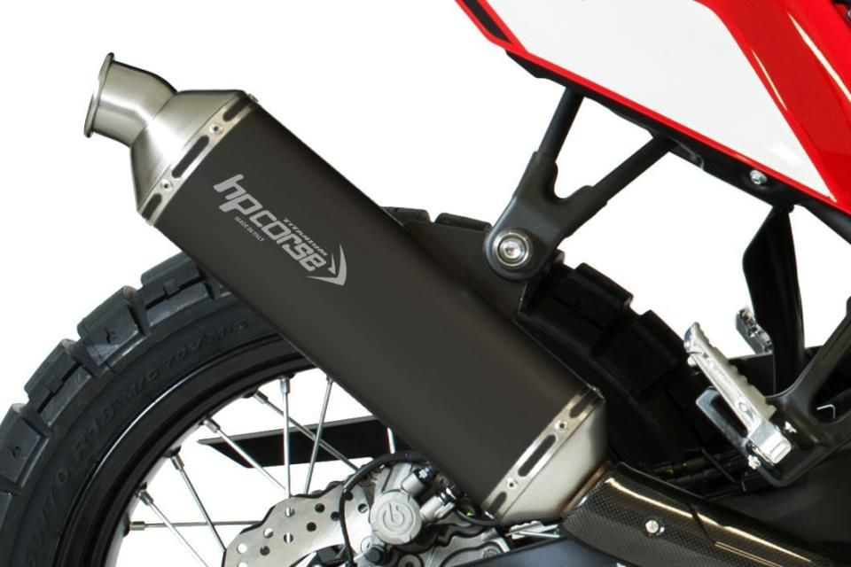 Diseñado por Hp Corse en el corazón del Motor Valley e inspirado en el gran Rally Africano, el nuevo escape SP-1 mira hacia el futuro leyendo y reinterpretando el pasado. Un escape de forma ovalada muy ligero dotado de un tubo redondo y esencial, sin soldaduras en el ángulo de curvatura, capaz de unirse perfectamente a la parte trasera del juguete de Iwata tanto en la versión CORTA de 30 cm con paso alto, como en la "estándar" de 35 cm con paso bajo equipado con una cubierta de carbono que protege del calor.